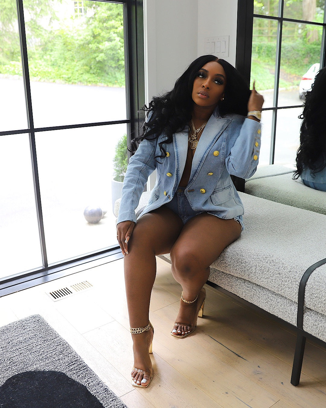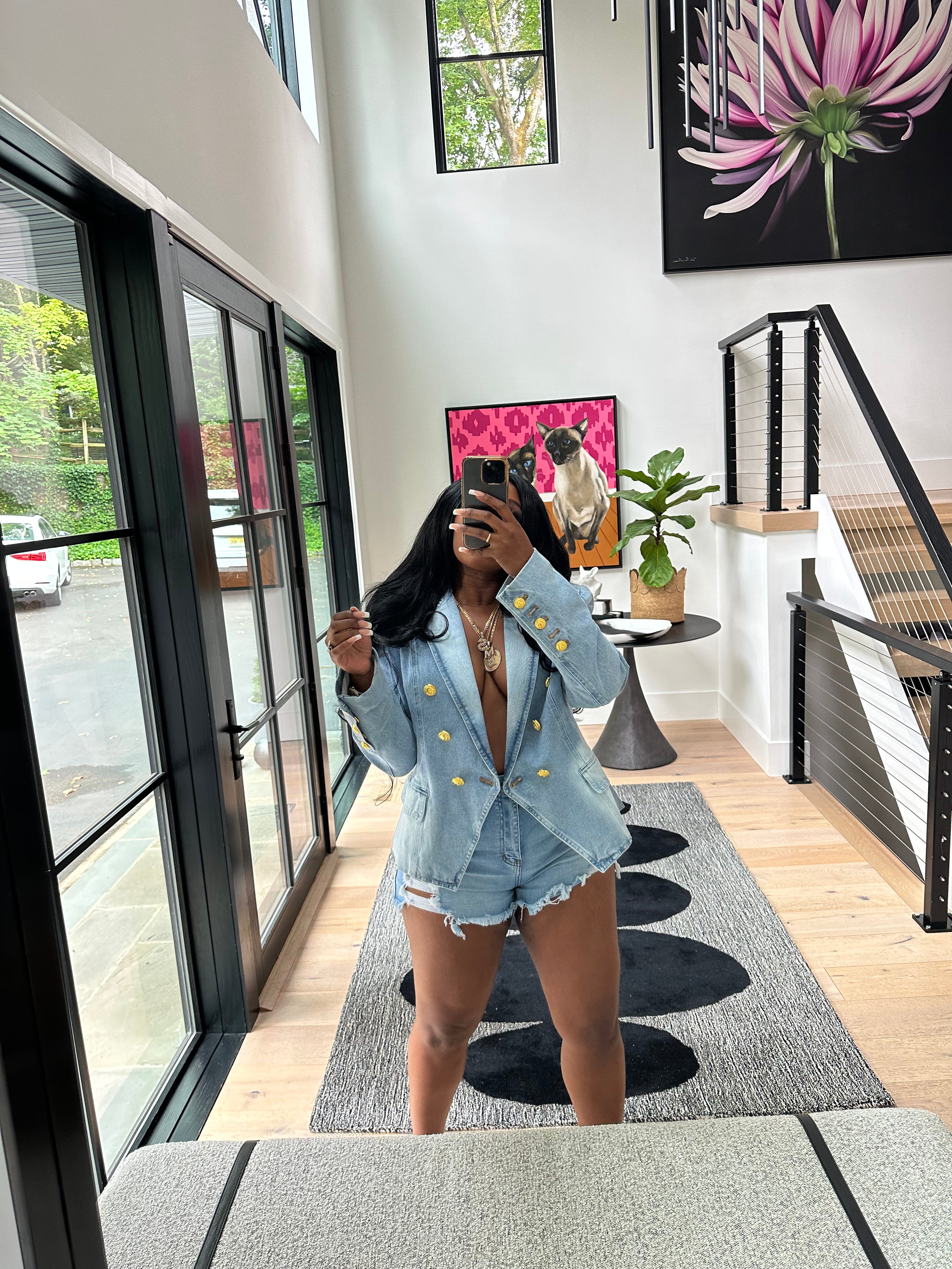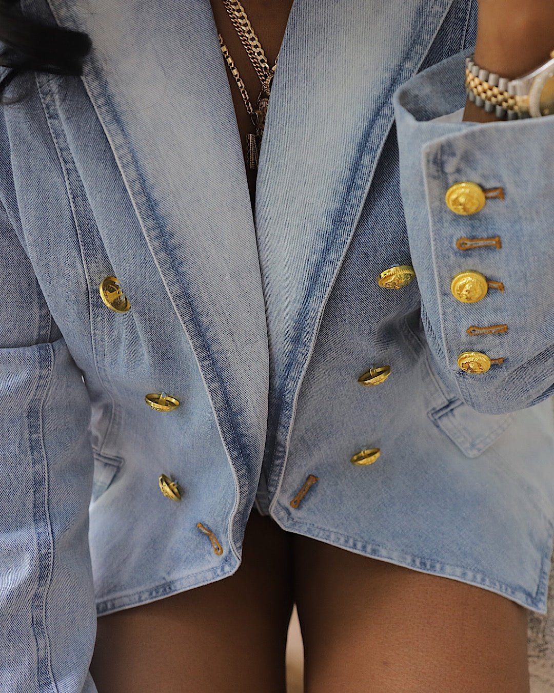 Double breasted denim blazer features gold button detailing