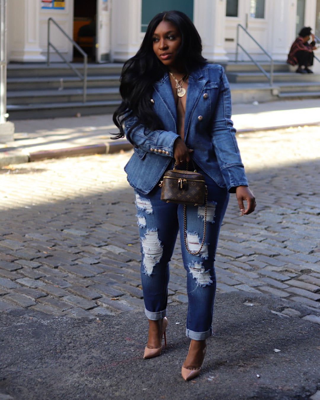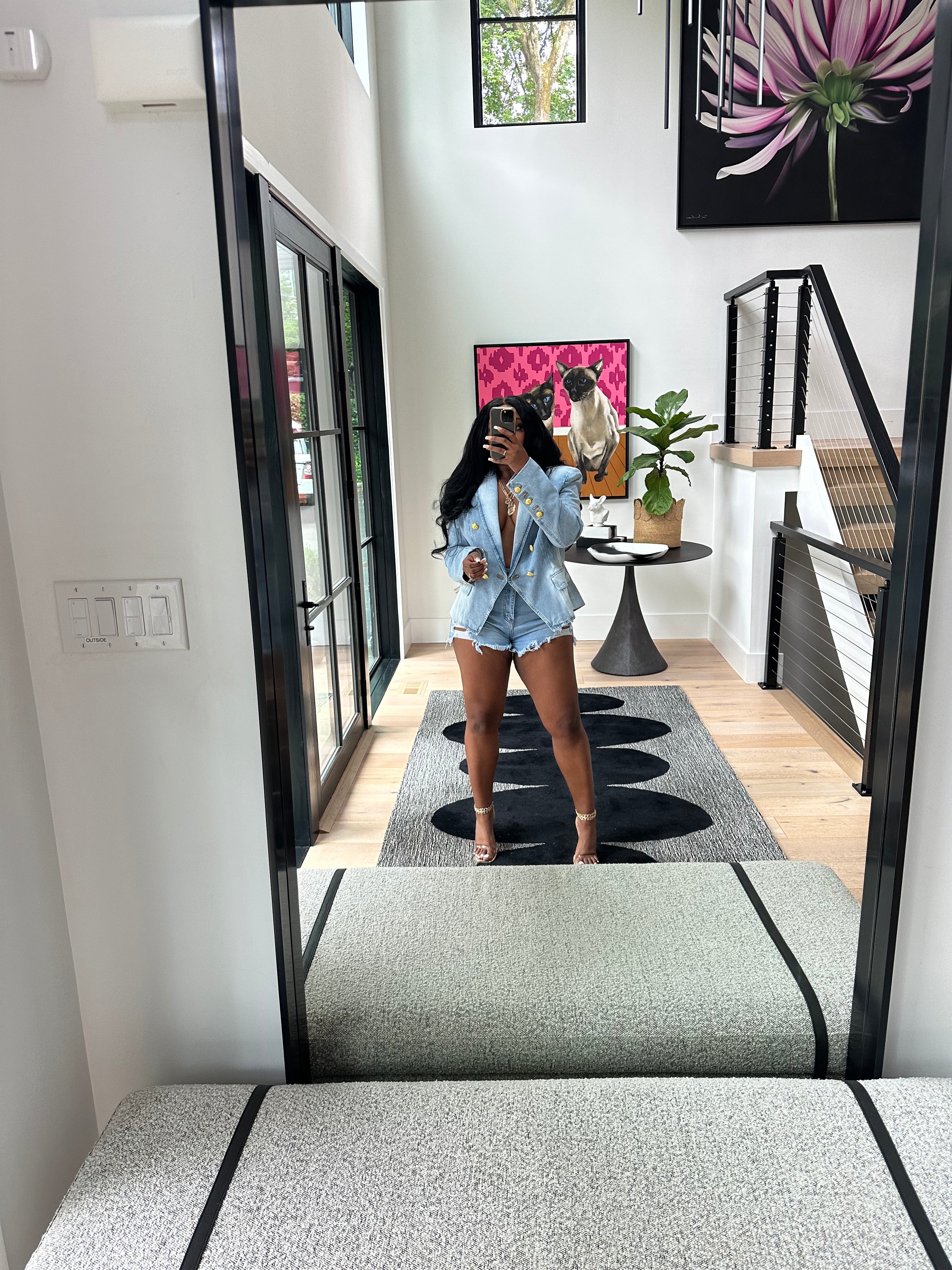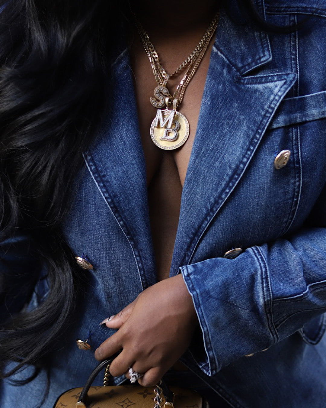 Double breasted denim blazer features gold button detailing