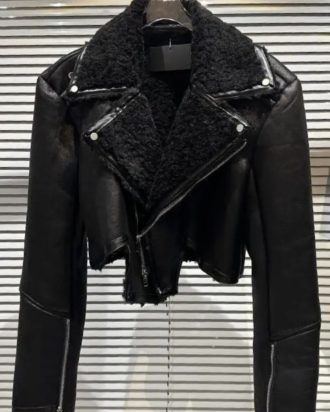 Distressed design motorcycle jacket perfect for the ultimate edgy fashionista. This item features faux shearling lining, unique zipper detailing making it a perfect essential in your closet: Make sure to complete the look with our My boot Thing boots or It girl boots. Style tip: This jacket doesn’t need much to sell a look. Pair it with a basic bodysuit and our It Girl shades. Model is wearing a M. This item runs slightly small, and refer yo size guide below